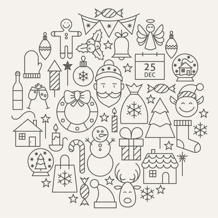 クリスマス新年休日ライン アイコン セット円形の形 装飾や祭の冷たいお祝いオブジェクトのベクター イラストです 冬のホリデー アイテム のイラスト素材 ベクタ Image